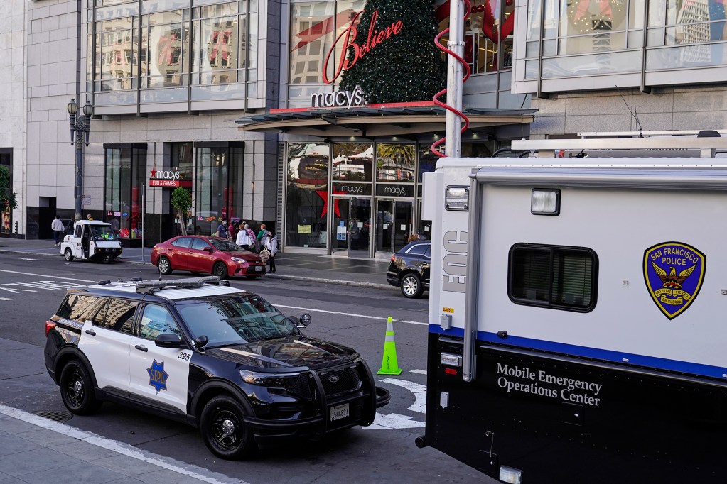 Police vehicles are stationed at Union Square following robberies in San Francisco on Dec. 2, 2021. Photo by Eric Risberg, AP Photo