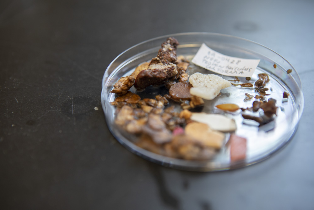 Inside were the remains of seabird food, like hooked squid beaks the size of fingernail clippings. Mostly, though, Beck found hard shards of plastic, soggy cardboard, styrofoam, and a maroon hunk of mystery meat that looked like beef jerky—until Beck cracked it open. Its innards were pure white: more styrofoam.